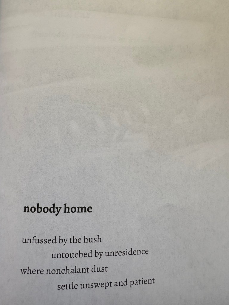 Form and style are played with throughout. White space is used to its maximum in the poem ‘Nobody Home’ and in ‘Airlock’ the slash method of line breaks is used to break up the text. The language contained within the pamphlet is incredibly considered and rich. ‘Reverie’ and ‘Reckoner’ are both exemplary in demonstrating this.