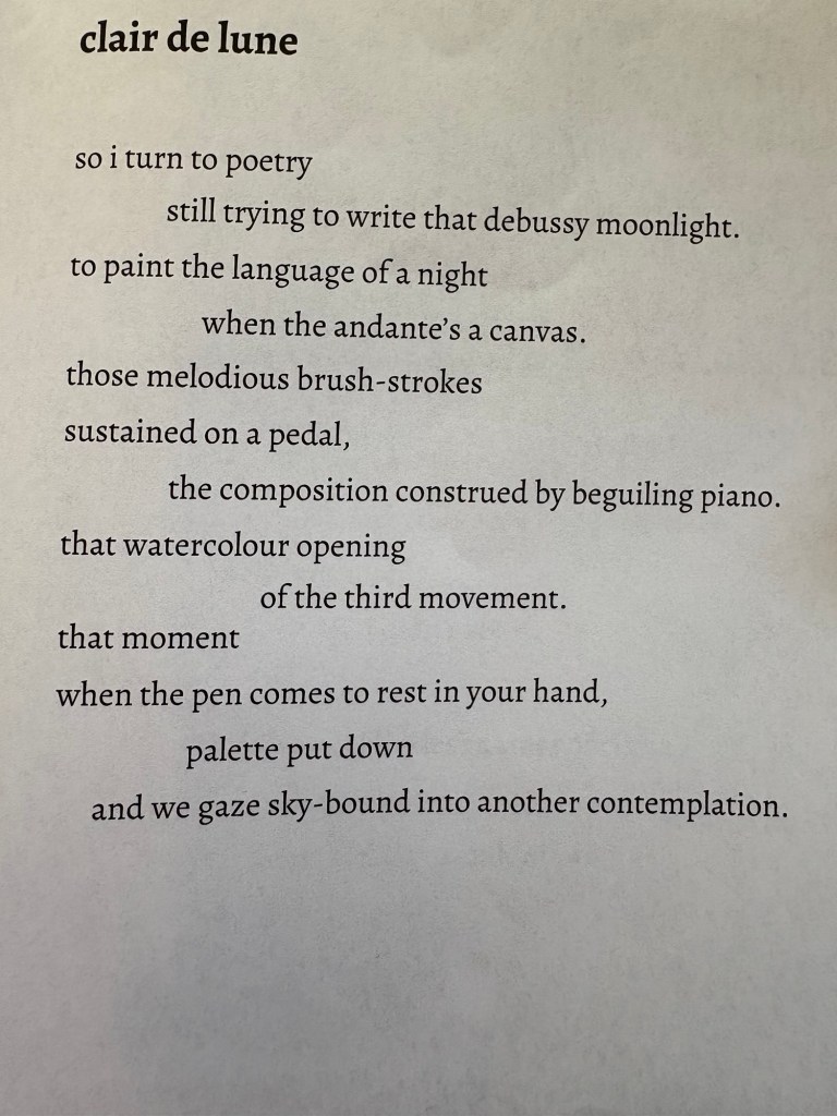 Dorian’s major strength is his sound patterning built on a base of incredibly lyrical and melodic language. Poems including ‘One’, ‘Narcissus’ and ‘Sparks’ (one of my favourites) are all prime examples of this using sibilance, alliteration, variations on rhyme. Also, I’ll drop a special mention for ‘Clair de Lune’ as being a gem of a poem (this is the first piece of music I learnt on the saxophone).