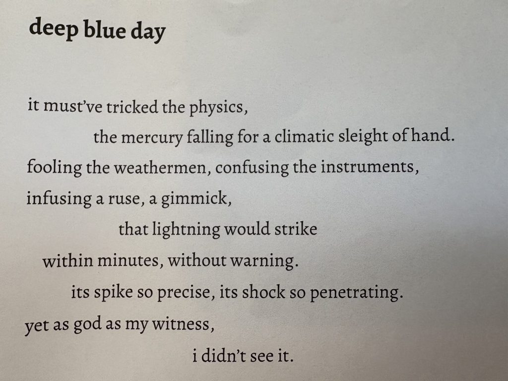 There is a vibrancy in the imagery of this collection. ‘A Day At The Beach’ is energetic with quick rhyme in the opening, pulling to a slower pace by the closing line. ‘Deep Blue Day’ is a slower paced piece from the start but maintains attention due to rich, vivid language.
