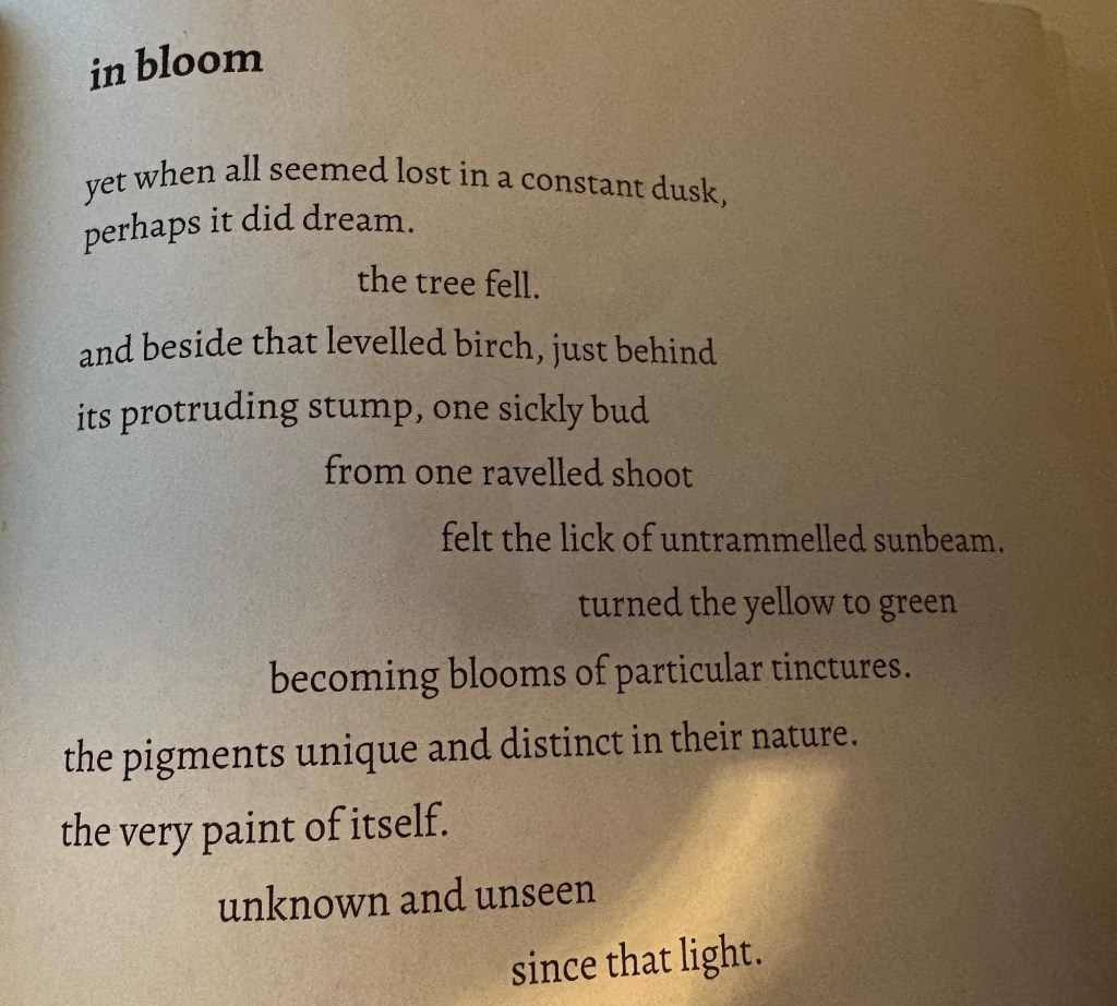 The pamphlet does not shy away from complex emotions. ‘Round and Around’ is an accomplished piece using the spin of a vinyl record as metaphor for waiting and longing incredibly well. ‘In Bloom’ is a great poem on resilience and creates a distinct engaging tone.