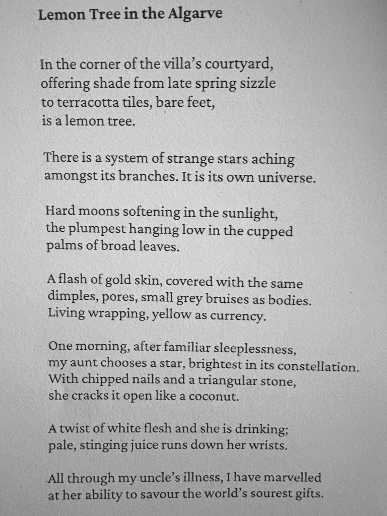 Grief is a thread throughout the collection and is dealt with in several ways. The poems ‘Lemon Tree in The Algarve’ and ‘Pourrir’ are captivating works that make you pause. ‘Learning Curve’ is poetry that bears a soul on the page and it made me well up on the train.