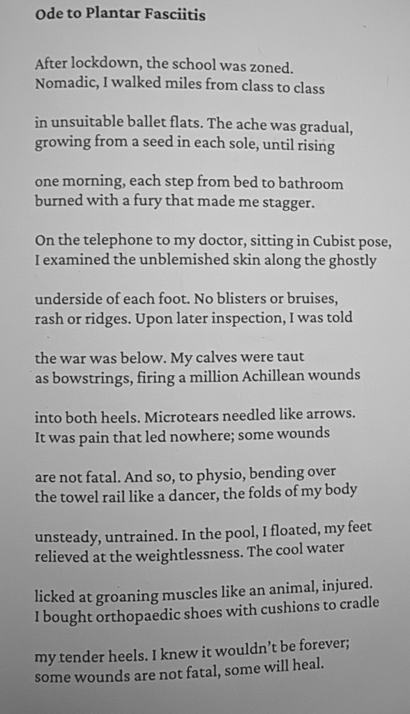 Styles and form vary. The piece ‘Shortbread’ (one of my favourites) uses couplets to move the poem along while allowing reflection. In ‘Ode to Plantar Fasciitis’ Bex uses couplets again but breaks lines unexpectedly so you build anticipation to read the next line because you want need to know what’s coming.