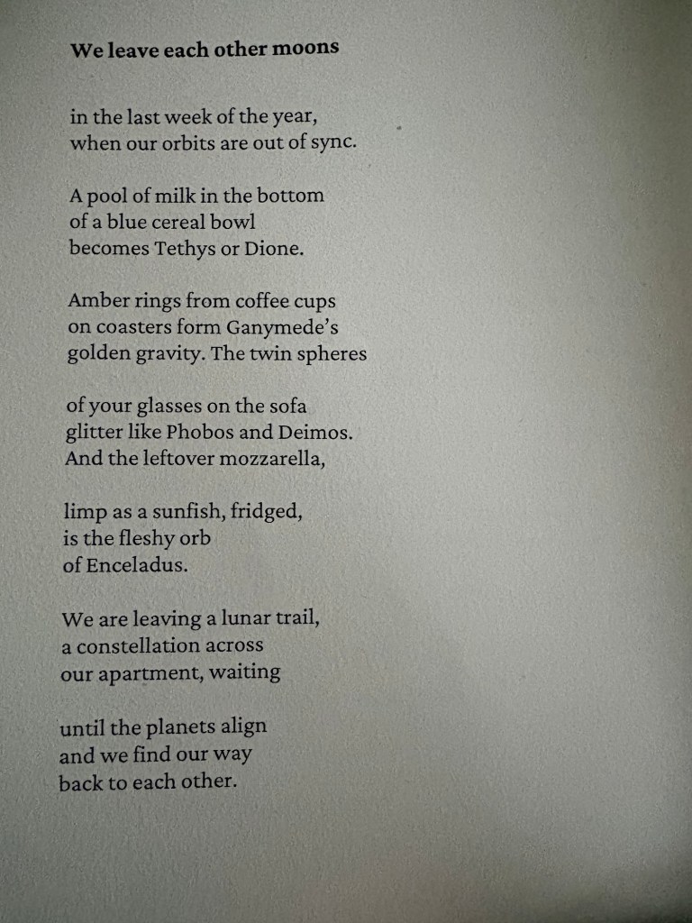 I’ve already mentioned ‘Camping’, ‘Circulaire’ and ‘Shortbread’ so I’ll add another handful based on my thoughts as I write this (I could add so many more). ‘Séance’, ‘We Leave Each Other Moons’, ‘Life, Death and the Struggle For Stellar Survival’, ‘Yorkshire Puddings’ and ‘Marriage Preparation Class When Loving For A Second Time’. And I have to include ‘Learning Curve’ for the physical, emotional response it triggered.