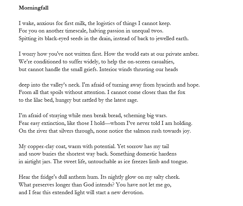 I am extremely grateful to be sharing a few poems of Vikki’s over the next month. It’s always a privelige when poets trust me to share work. For Vikki’s first poem, I have selected the incredible piece, ‘Morningfall’.