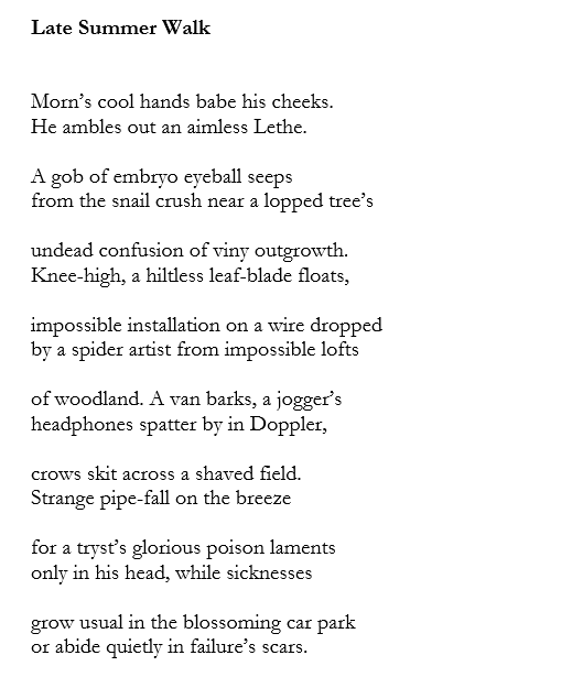 Vivid imagery is on display throughout the collection. The pieces that form the ‘With Love, Grief and Fury’ sequence and ‘Autumn’s Secretary’ demonstrate this as does ‘And The Moon Don’t Talk To Me’ Anymore. One of my favourites is ‘Dog Days Done’, it has an authentic hope.