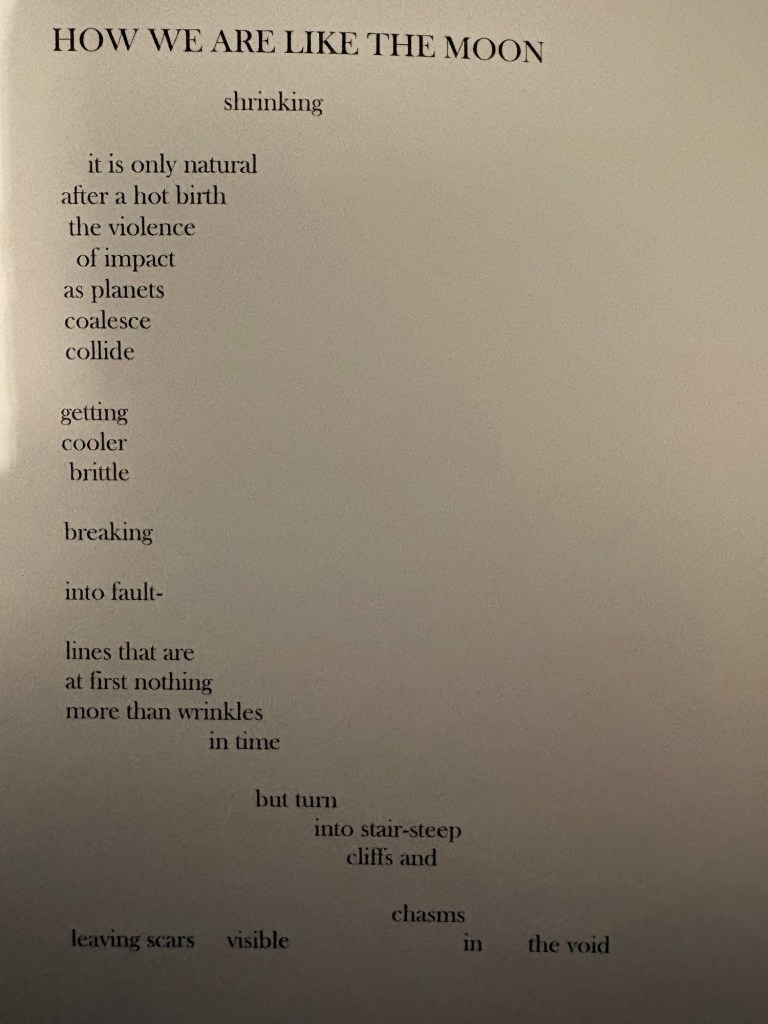 Louise plays with form in various ways throughout the collection. The use of white space in ‘The Impact of Atmospheric Change on Bird Flight’ is put to great use supported by beautiful language. The shaping of ‘How We Are Like The Moon’ is terrific and seems to shift depending on how you hold the book in your hand. The piece ‘Memories Left By Water’ (one of my favourites) is a skilled crafting of a piece that can be read as three different poems.