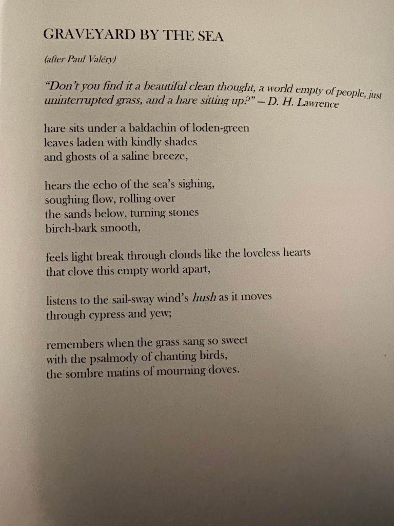 Readers are immersed in vivid scenery in poems such as ‘Graveyard by the Sea’ which uses multi-sensory language to immerse the reader. The piece ‘Spirit Bear’ (one of my favourites) puts us firmly in nature with a sense of motion.