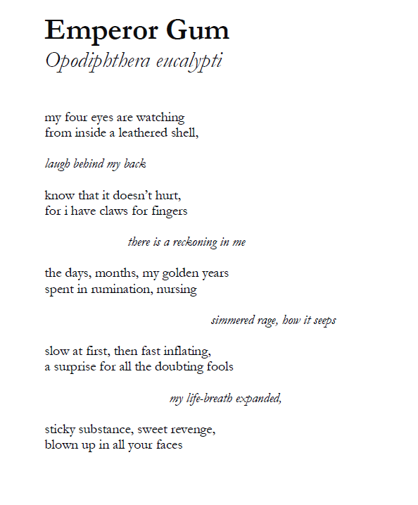 #Moth truly is a fantastic and special book. I’m thrilled that Eleanor and Ethel Zine vision was realised in the production of #Moth. ‘This second poem ‘Emperor Gum’ is another of my favourites.