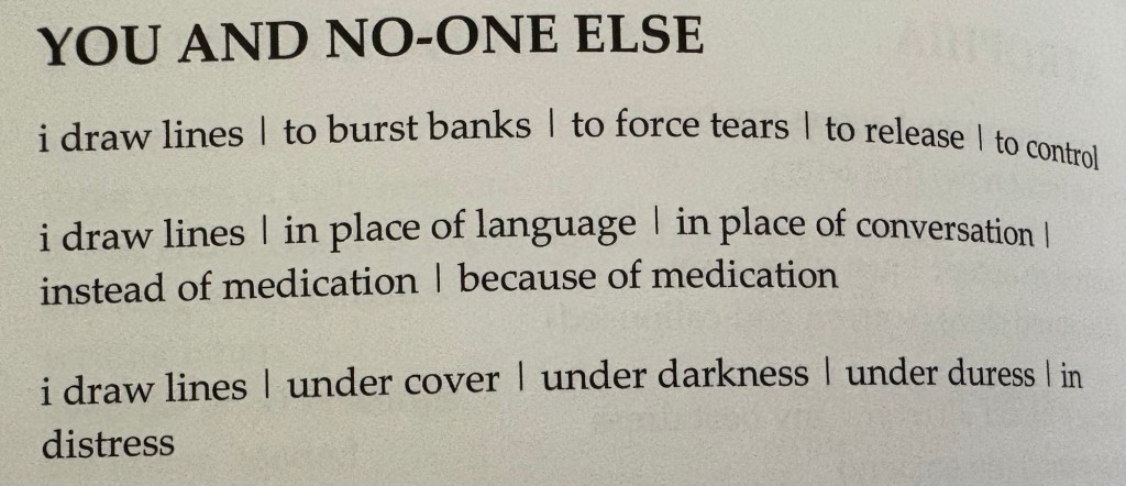 Sue is deft at surrealist poetry too. The piece ‘I Hate You’ opens with an interaction between narrator and cow, a heron and an unknown bird. One of my favourite pieces ‘A Pelican Is Dancing On The Patio’ explores perception incredibly. ‘I’ve Nothing To Offer The White Horse In The Dream’ feels like a reckoning and I flinched on reading (I do have a slight fear of horses).