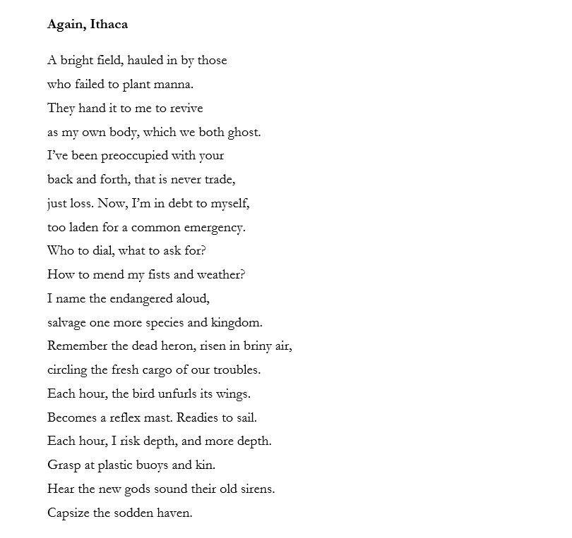 Today, I’m sharing Vikki’s 2nd poem, Again, Ithaca. This is a poem rich in language, physicality and metaphor.
