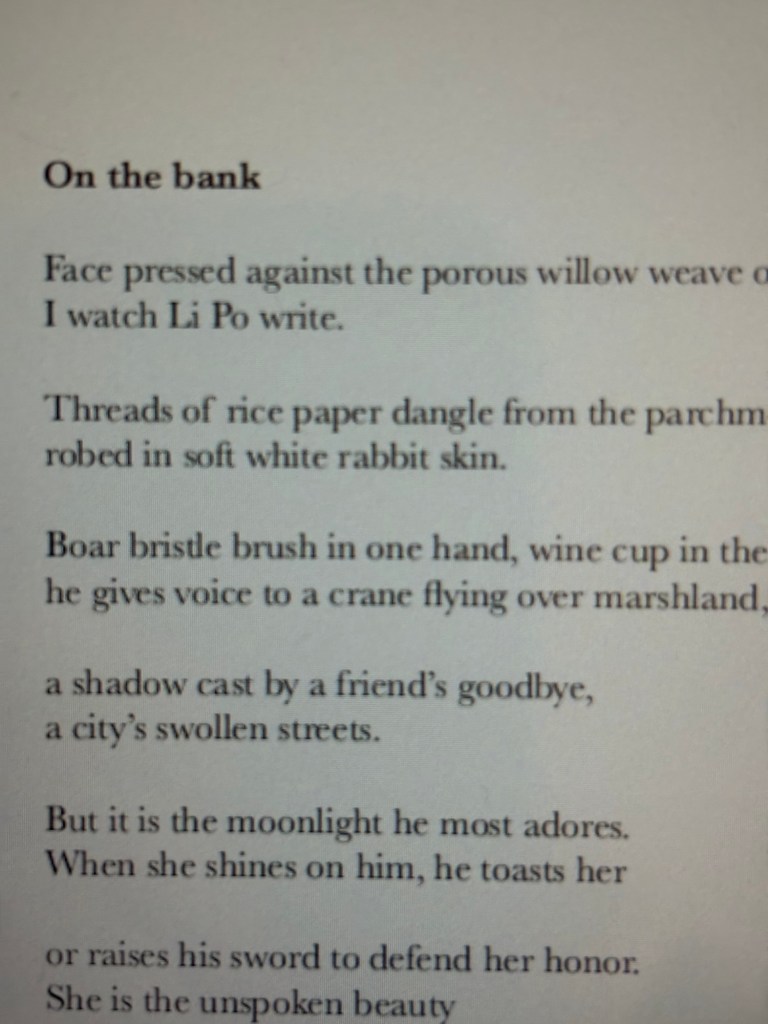 Down River with Li Po transports us back in time and space back to 8th Century China during the Tang Dynasty whilst also having a foot in modern California. This adds a great dynamic to the collection as the parallels become visible.