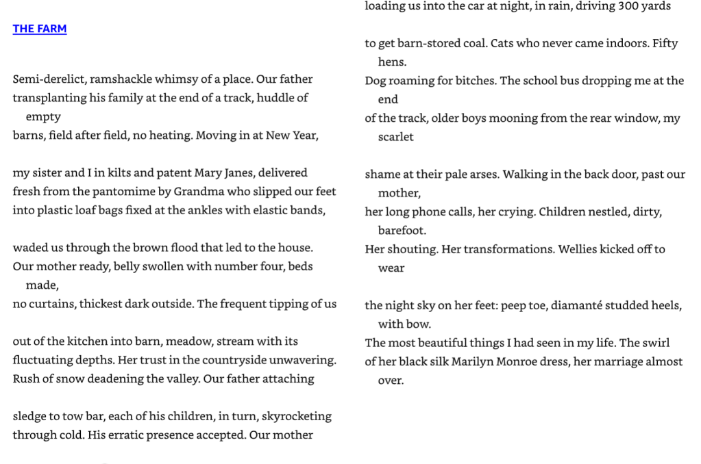 This month I will be sharing a few pieces from Rebecca’s collection, ‘Latch’ available to buy from Carcanet here which previously is a A London Review Bookshop Book of the Year and has been longlisted for the Longlisted for the New Angle Prize for Literature 2025. Carcanet have kindly provided rights for me to share images and poetry.