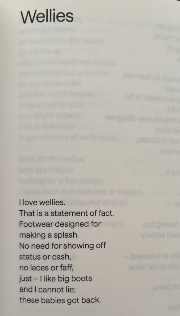 The book balances the joy and happiness with reflections on serious matters. The poem, ‘Trying’ really hit me hard and in my opinion is such an important piece from a males perspective. Beneath the humour and metaphor, the book explores themes including masculinity in the piece ‘Wellies’ and coming to terms with mortality in the excellent ‘Sunflowers’.