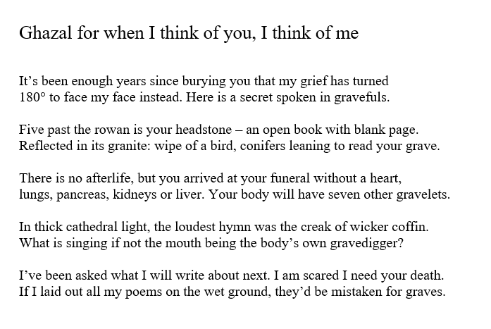 The first poem, is ‘Ghazal for when I think of you, I think of me’.