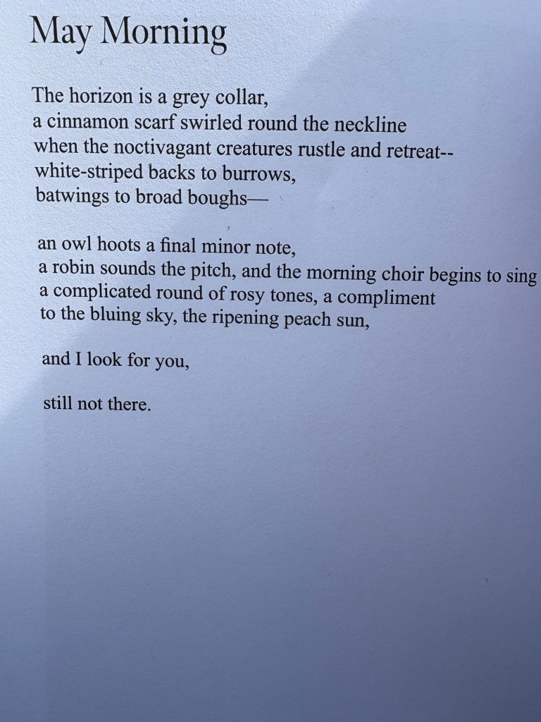 I’ve already mentioned In Memoriam: for the Unknown Soldiers at Red Bank Battlefield’ but I’ve also got a few more to mention. I’ll add ‘At The Corner of First and Always’, ‘In Paris and Beyond’, ‘The Power of Gravity and Light’, ‘This Is Not—and Is’, ‘Letter From My Mom’ and ‘Horses’.