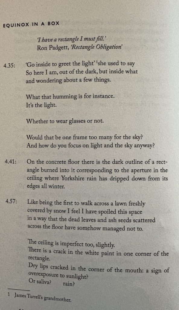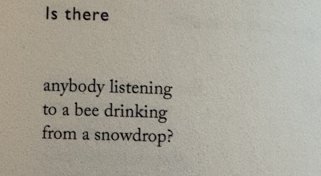 A key strength in the book is it’s shifts. Not just in theme and format but in rhythm and pace. Read the sequence on snowdrops within ‘Reading In The Rain: An Essay’. Sublime.