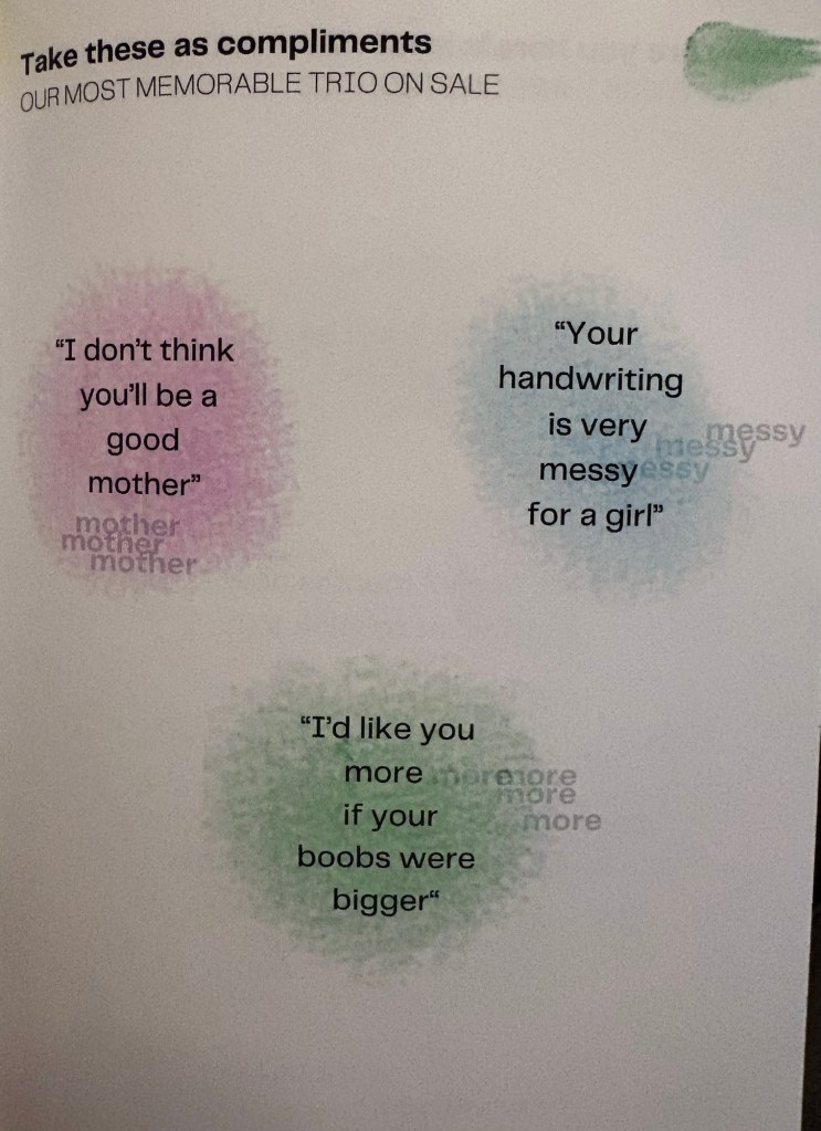 Within the book Leia examines perception and critique and how this informs life. The pieces ‘Frequently ignored questions’ and ‘Take these as compliments’ are a commentary on social and societal attitudes to women and are stark.